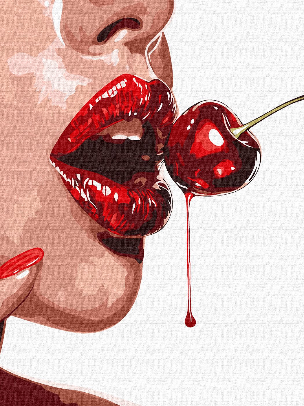Rosto feminino estilizado com lábios vermelhos e cereja vermelha com gota