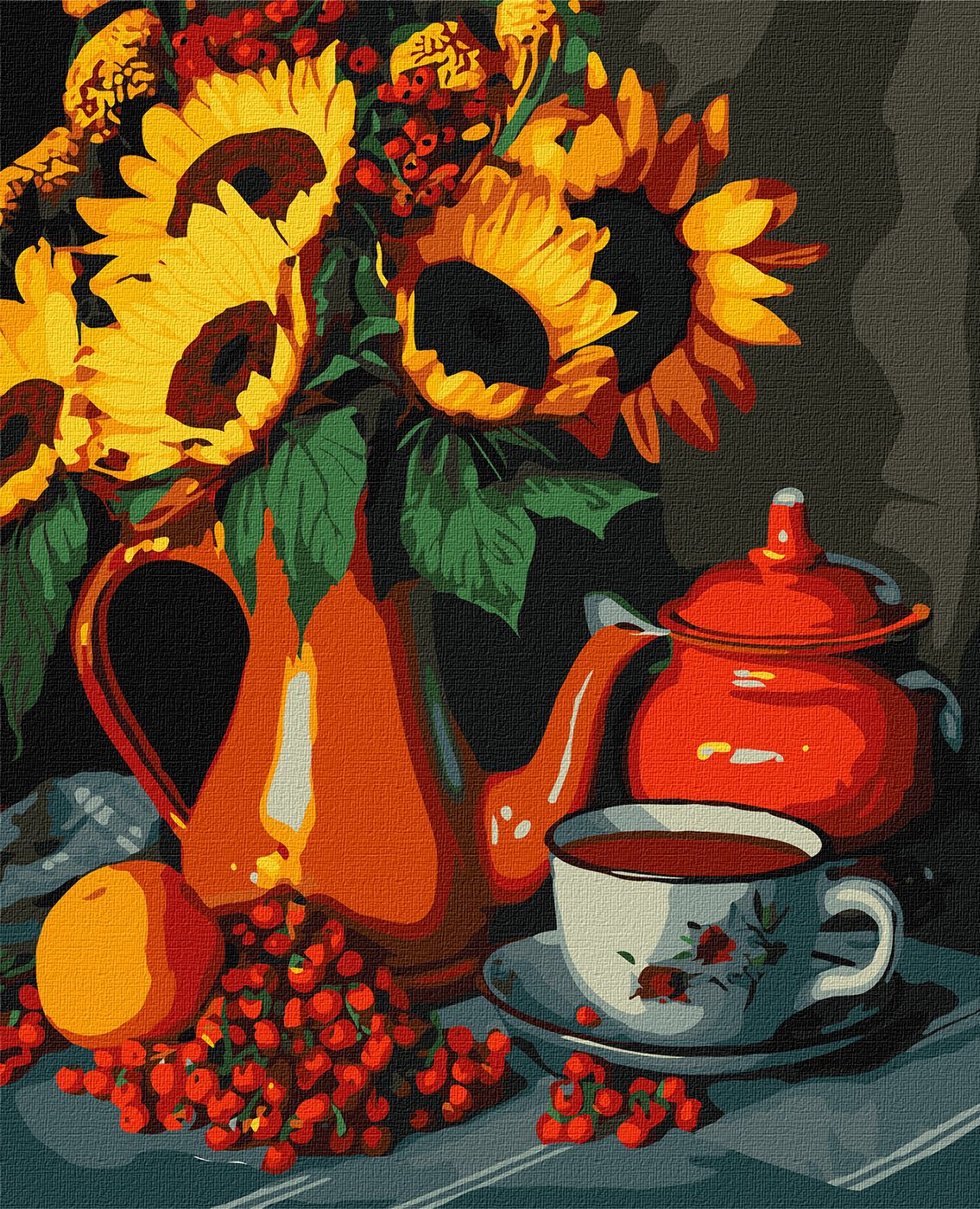 Buquê de girassóis em jarra laranja, bule vermelho e chávena com padrão floral sobre toalha azul.