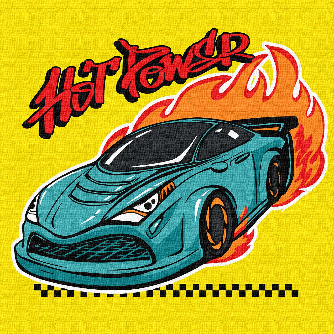 Desenho digital de carro desportivo azul com chamas e texto Hot Power