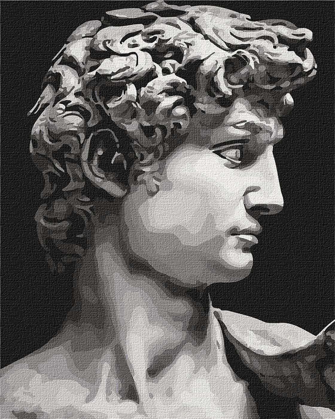 Escultura clássica masculina em tons de cinza, vista de perfil