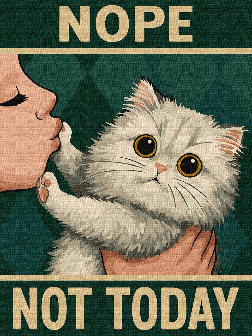 Poster ilustrado de um gato branco e um rosto humano com texto NOPE NOT TODAY
