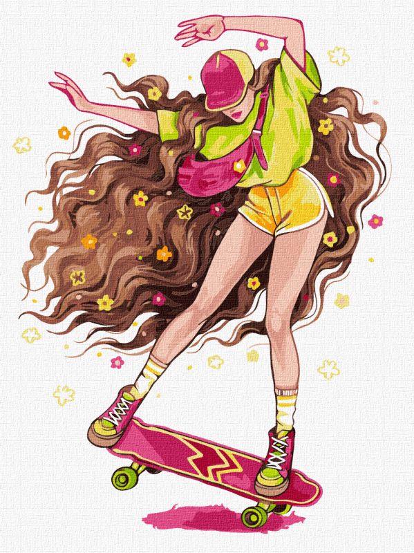 Ilustração de jovem a andar de skate com roupa desportiva colorida e flores no cabelo