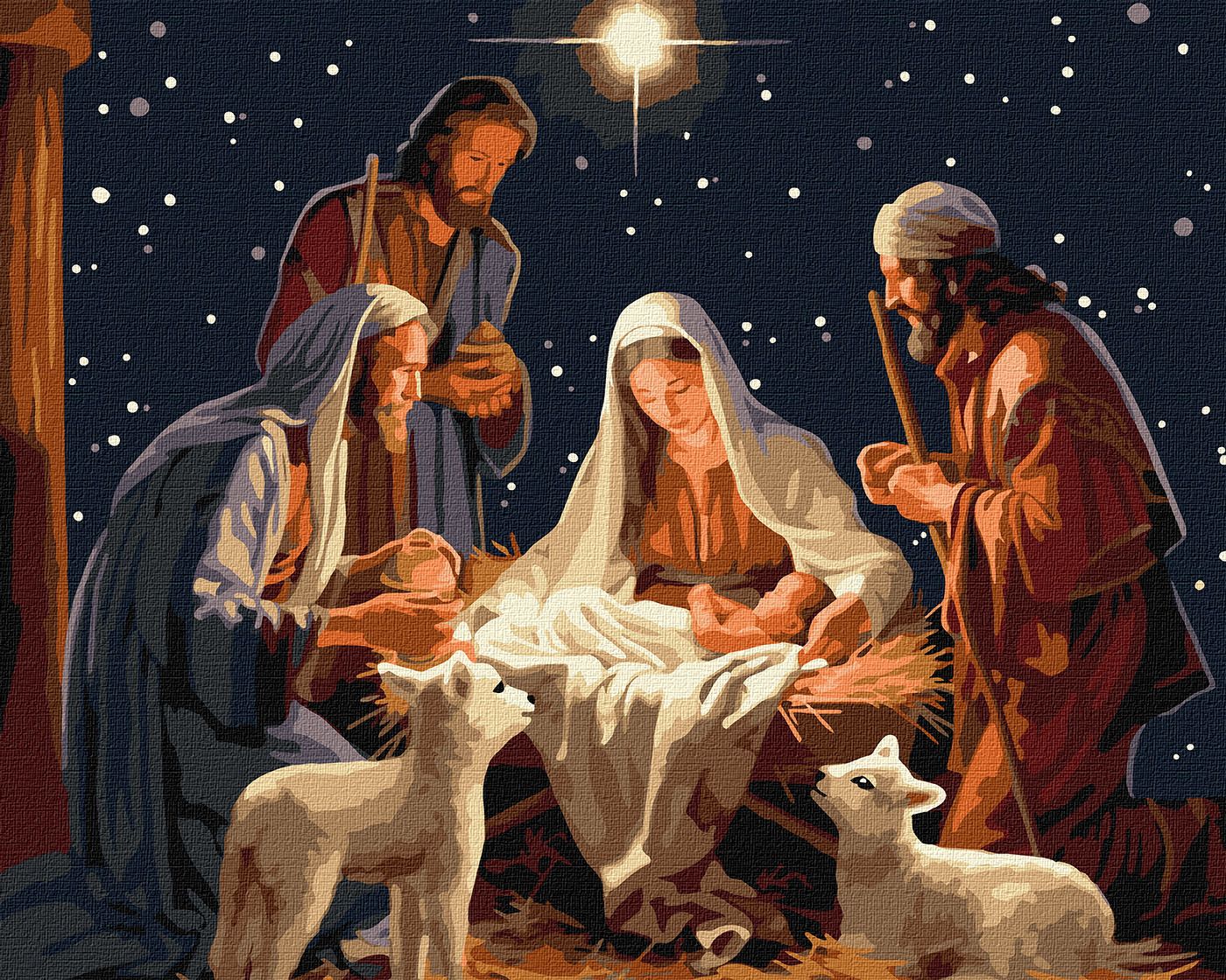 Cena do presépio com Maria, José, Menino Jesus, pastores e ovelhas sob um céu estrelado