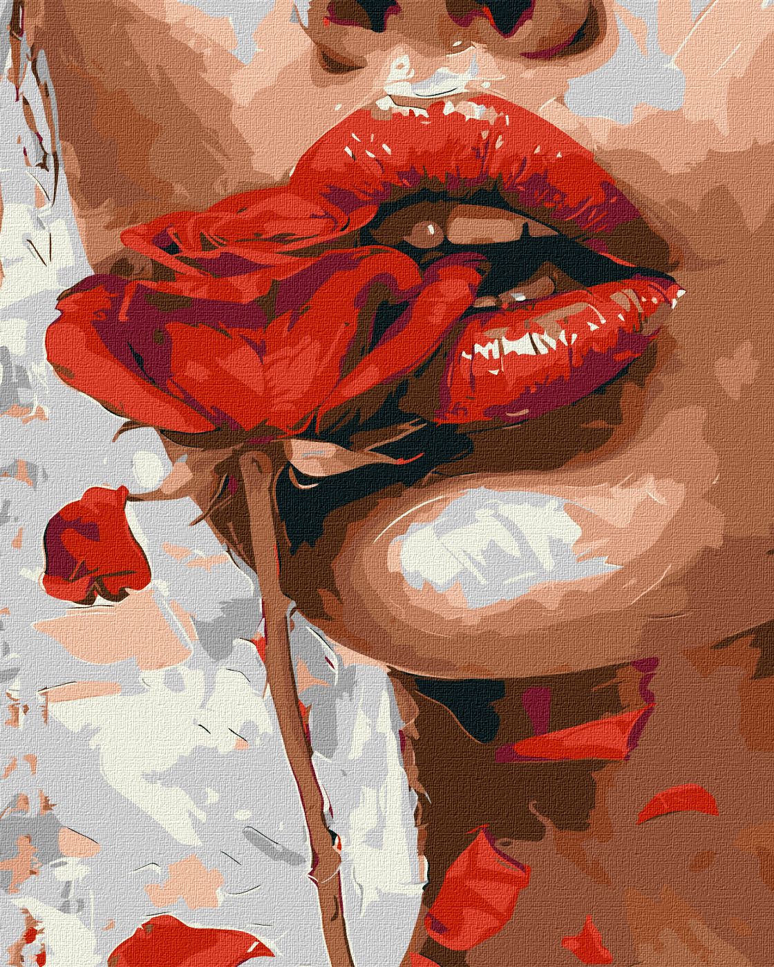 Boca feminina com lábios vermelhos e rosa vermelha entre os dentes em estilo pintura